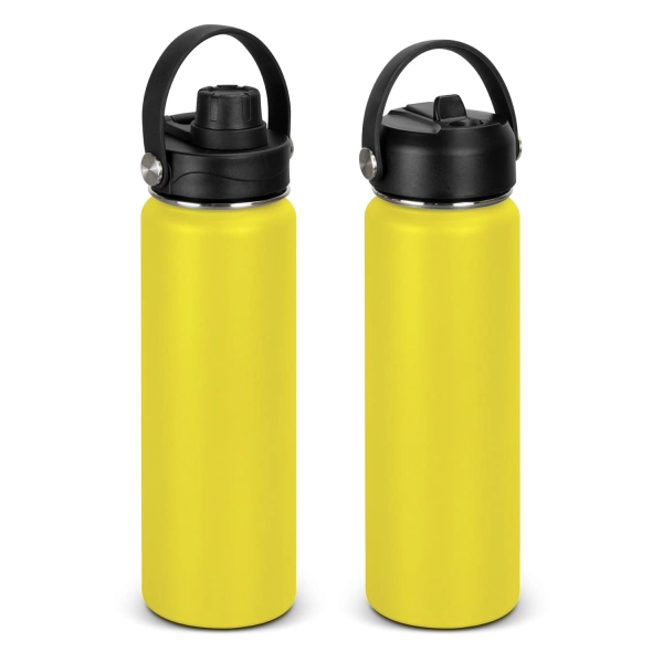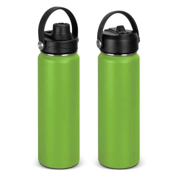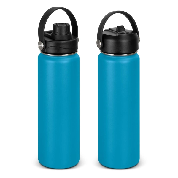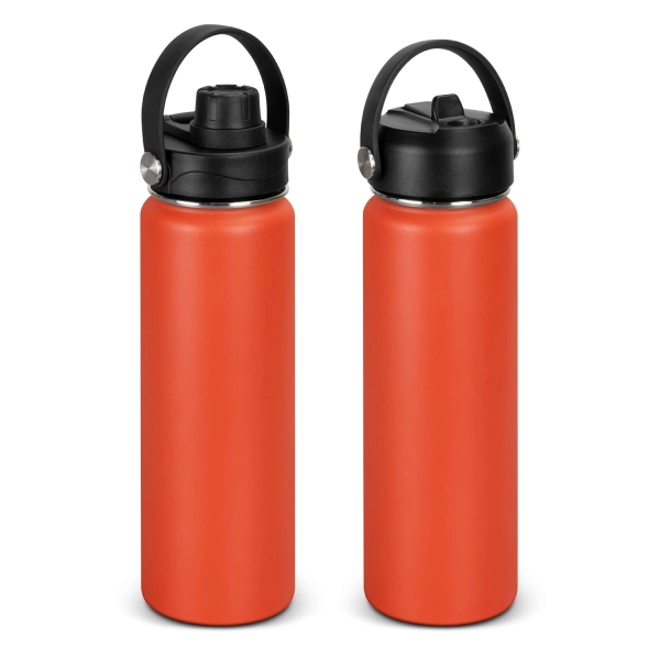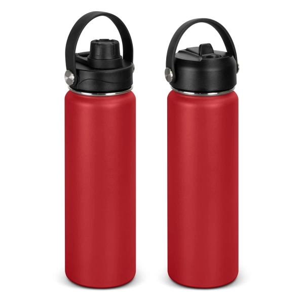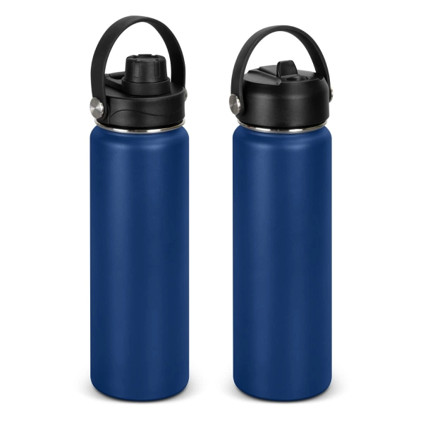 This BPA-free 800ml robust drink bottle is ideal for staying hydrated on the go. Combining stainless steel and polypropylene for a stylish drinking accessory. This double wall, vacuum insulated bottle features a powder coat finish and a secure screw on lid, with a choice of either a flip valve sipper, or a screw on chug cap. The Kinmont drink bottle blends practicality and style, highlighted by its carry handle and eye-catching silver rivet accents. This product is not dishwasher safe, and handwashing is recommended.