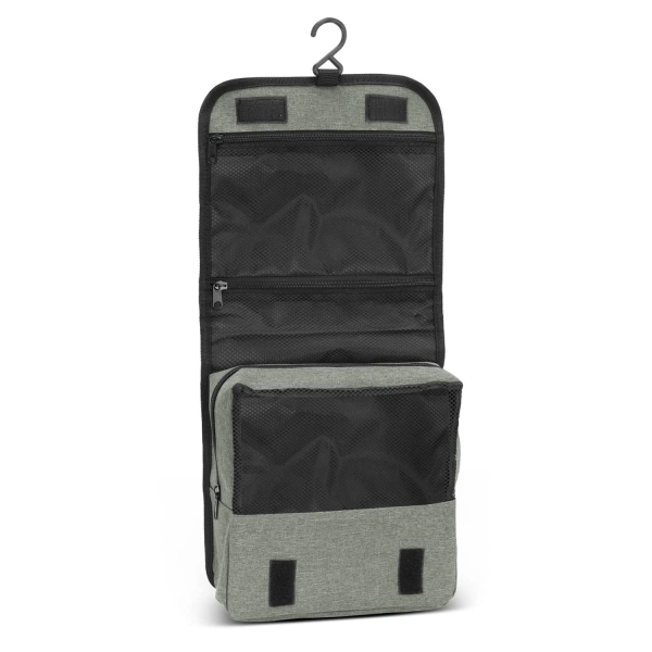 Lightweight toiletry bag with a two-tone heather style fabric finish and plenty of storage. It is manufactured from 300D polyester with a 210D polyester lining. Knox features a Velcro closure, two zippered mesh pockets and a zippered main compartment with a mesh window. It also has an external zippered pocket, a carry handle and a handy hook.