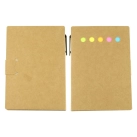 A multi-purpose note pad which has a 50 leaf note pad a 25 leaf pad of adhesive notes five different coloured pads of adhesive paper flags (blue pink orange yellow green) and a recycled cardboard barrel pen that slips into the spine of notebook. Unbleached natural cardboard cover with a secure closure. A very handy notebook for office staff and students.