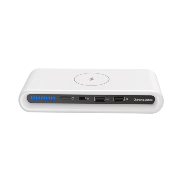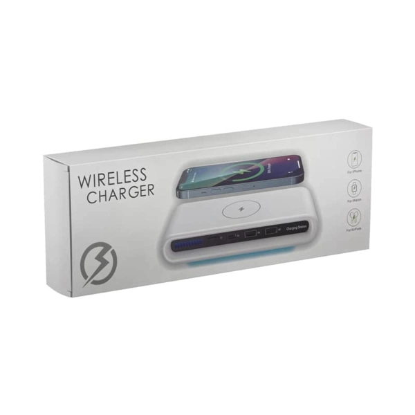 Bid farewell to the chaos of messy cables with the Korda multifunctional charging station. Delivering 15 Watts of wireless power to your Qi-compatible devices, the side indicator lets you quickly find your phone in the dark and adjust the ambient light at the bottom by pressing the on/off button. The sleek-looking Korda has three additional USB fast charging ports, allowing simultaneous charging of multiple devices. Equipped with Foreign Object Detection, the charger protects against over-current, over-voltage, and short-circuit, ensuring this multi-port charging dock is safe and worry-free. Please Note: Your phone must support fast charging, and for optimal performance, you use a Quick Charge 3.0 wall adaptor (not included). Includes Type-C charge cable and user manual. Material: ABS, PC.