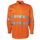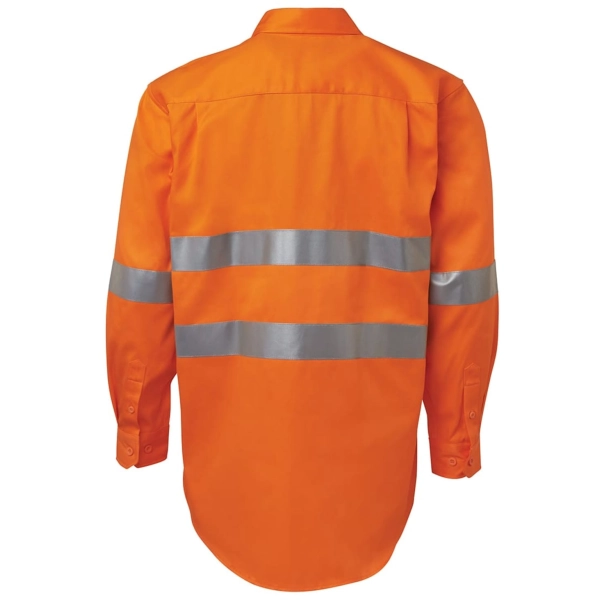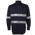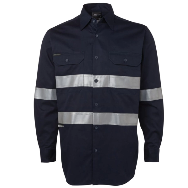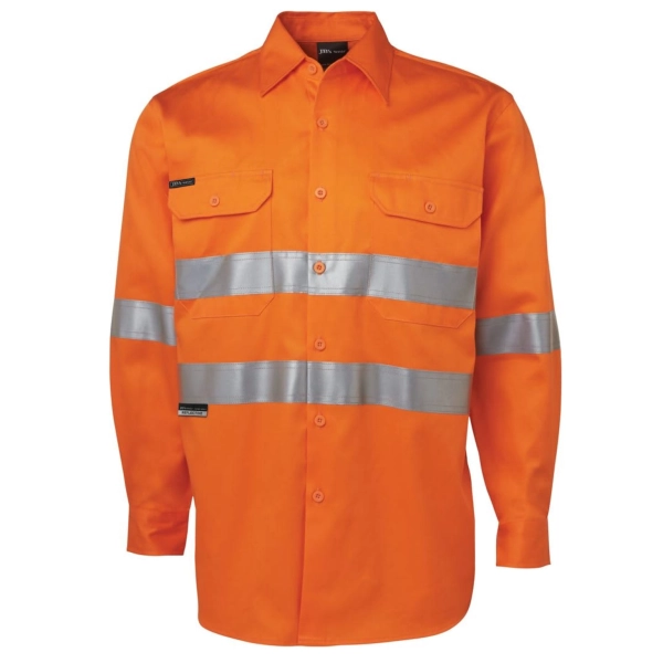 Classic fit | 100% Cotton for 100% comfort, 190gsm double pre-shrunk drill | JB's reflective tape stands up to 50 times domestic wash | Orange shirt complies with Standards AS/NZS 1906.4:2010 and AS/NZS 4602.1:2011 Day and Night | Navy complies with Standard AS/NZS 4602.1:2011 Night Only | Two-piece collar | Two front pockets with button-down flaps and pen insert | Curved hem with back tail styling | All pressure points bar tacked for extra strength and durability | Complies with Standard AS 4399:2020 for UPF Protection | 6/7XL only in Navy
