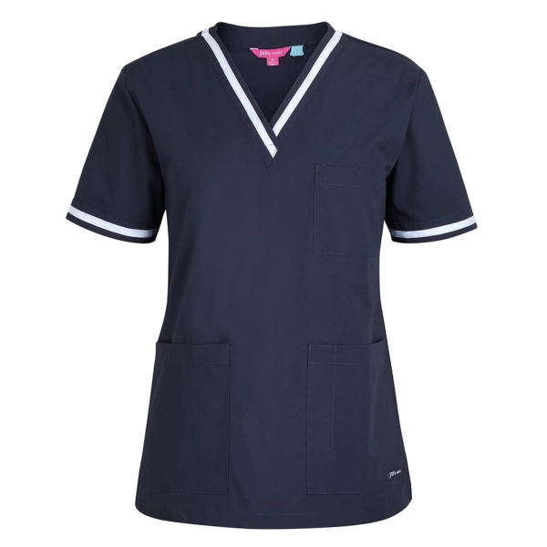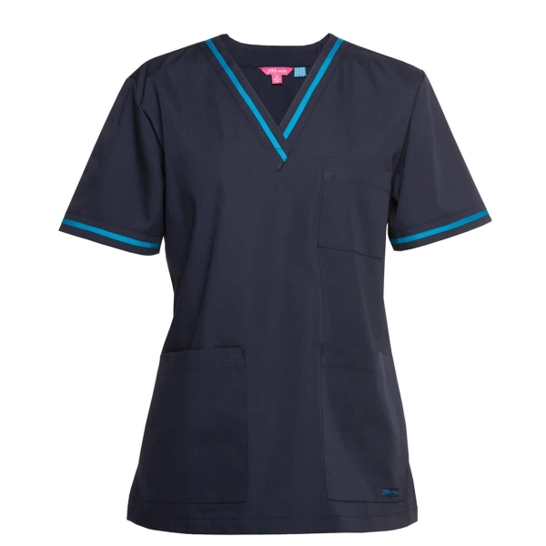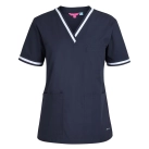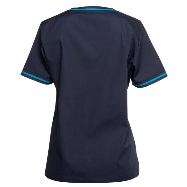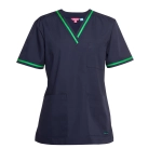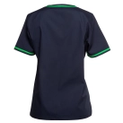 Classic fit | 65% polyester 35% cotton 180gsm | V-neck top, set in sleeves, side vents, size identify colour loop sewn next to main label | Contrast colour tape on collar and sleeve hem | Two lower pockets, left hand pocket with pen insert | Right hand pocket with utility tape and loop