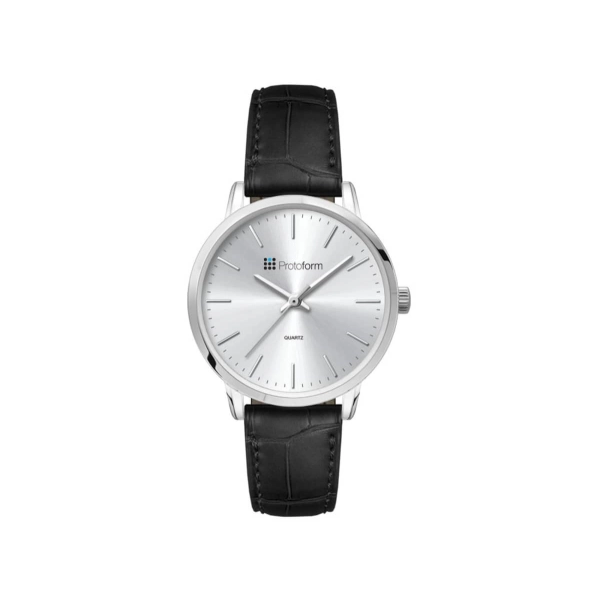 This quality ladies dress watch features an Ionic steel plated alloy case, sunray silver dial, padded black croco leather strap and is water resistant to 3 atm’s. For mens size see W6016S12-M.