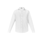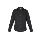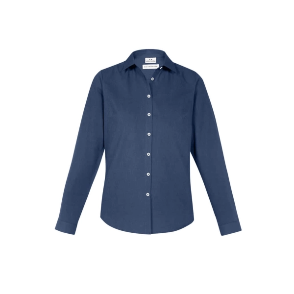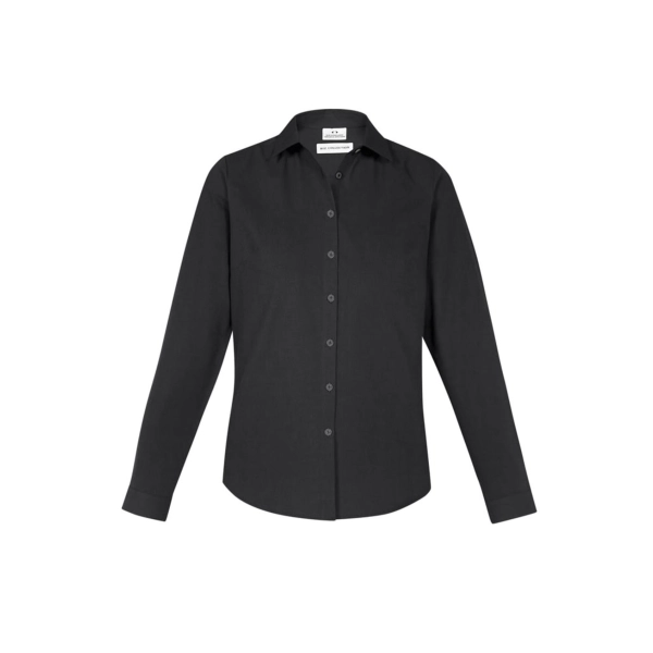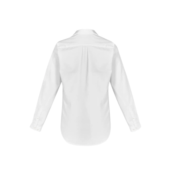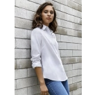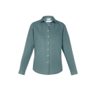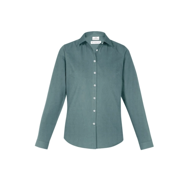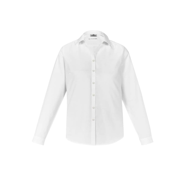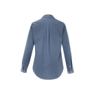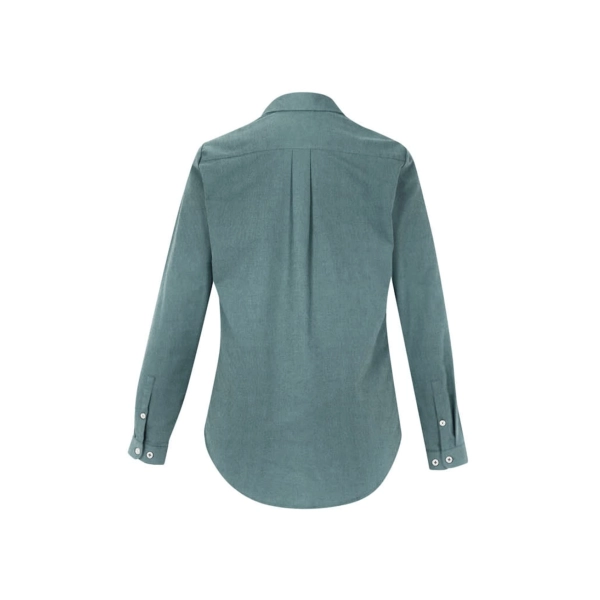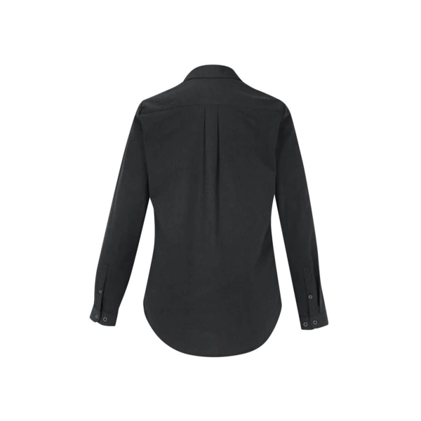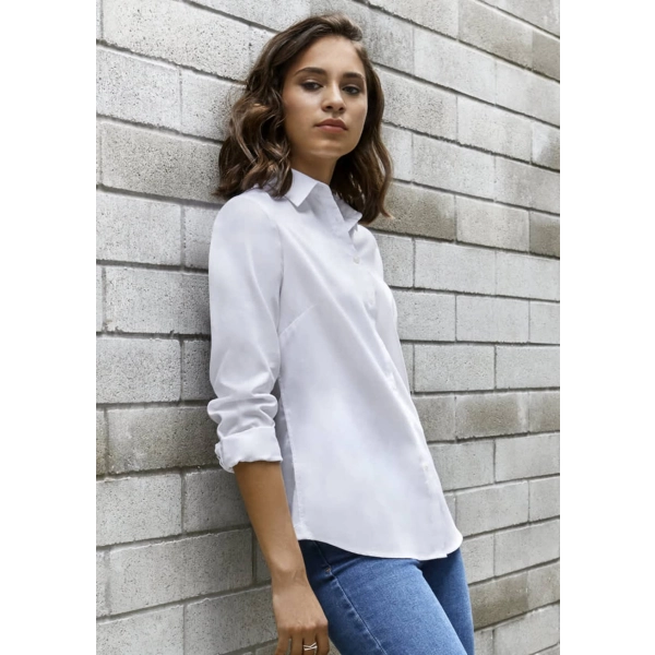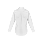 Ladies style features semi-fitted silhouette, with shirt tail hem and back box pleat