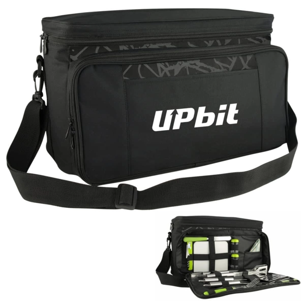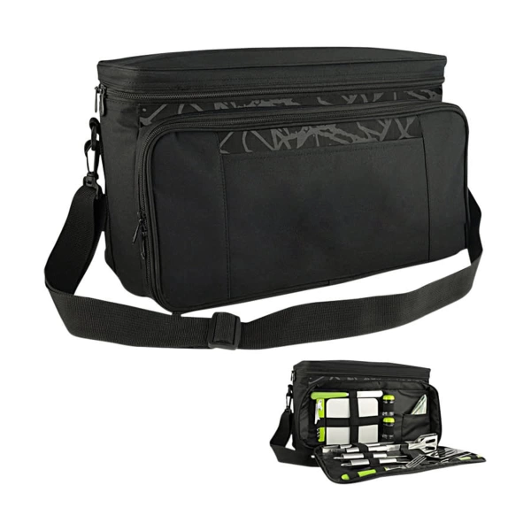 This large zippered cooler bag is your perfect outdoor companion. Made from durable polyester, it comes with an adjustable shoulder strap for easy transport. Inside, you’ll find everything you need for the perfect BBQ—3 BBQ tools, 2 knives, a cutting board, salt & pepper shakers, a fork, a bottle opener, and a napkin. Supplied in a polybag for extra protection, it’s ready for your next grilling adventure.