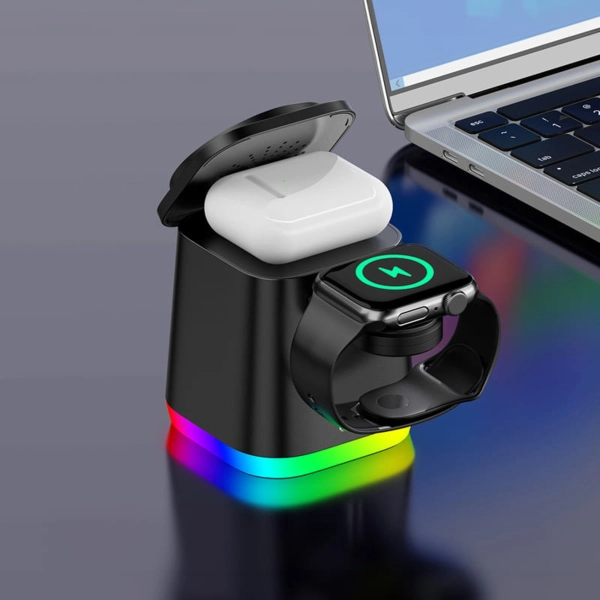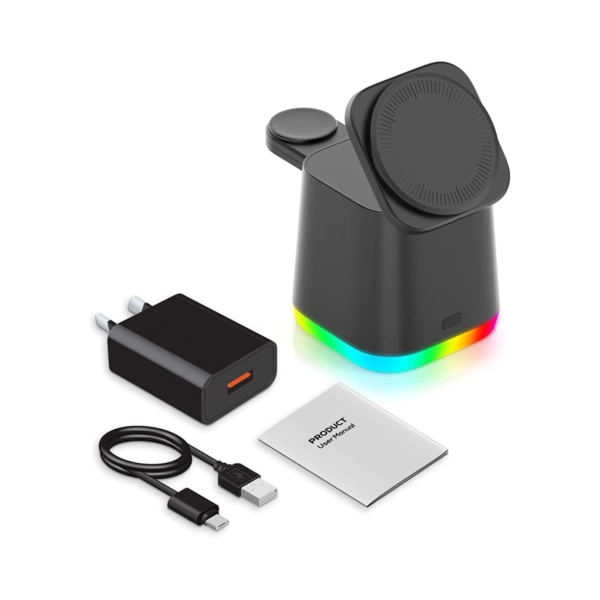 The Lamar 15W magnetic wireless charging stand is foldable and compact, making it an ideal desktop or bedside device. It simultaneously allows for quick and efficient charging of your Qi-compatible phone, TWS earbuds with wireless charging cases, and an iWatch or Samsung Galaxy Watch. This stand features magnetic phone charging in portrait and landscape orientation, a switchable tricolour nightlight and a detachable watch charger that can be removed and used independently via any USB-A port on the road. Safety is a top priority with this device, which includes ventilation holes that help reduce heat build-up, foreign object detection, overcurrent protection, and short-circuit prevention. The package includes a Type-C charging cable, an 18W (QC3.0) wall adaptor, and a user manual. Materials: ABS, Acrylic.