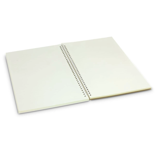 Fully customised A4 size notebook with silver wiro binding and 60 leaves (120 pages) of 70gsm cream paper which is available lined or unlined. Individual pages can be customised in one colour or full colour for an additional cost. The notebook has an 1100gsm unbleached grey cardboard back cover and a 350gsm cardboard front cover which can be branded with stunning edge-to-edge full colour print. A production lead time of 35 working days applies to this product by air freight and larger orders can be sea freighted on request to reduce the freight cost.
