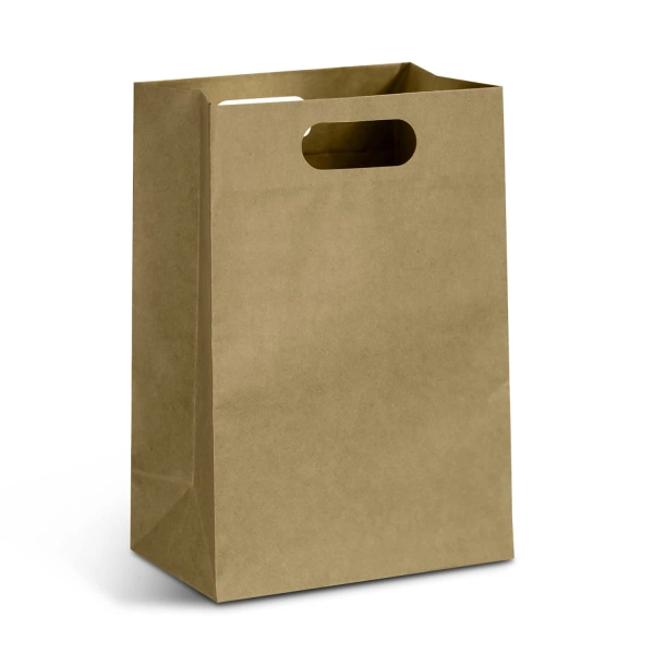 Large carry bag made from 180gsm paper with die cut handles. The handles and gusset are reinforced with 600gsm card for added strength. This bag is portrait orientated with handles and gusset along the shorter edges