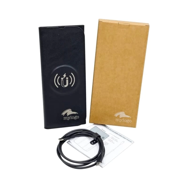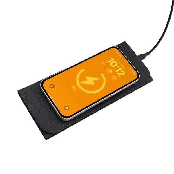 The Lawton mouse pad merges magnetic wireless charging technology with a foldable mouse pad, allowing you to use your mouse while charging your phone simultaneously. It delivers a 15-watt output and includes foreign object detection, overcurrent protection, and dynamic power-limiting safeguards. Made from 60% GRS recycled materials, including recycled ABS, PU, and paper, the Lawton offers an environmentally friendly alternative compatible with any smartphone or device that adheres to the Qi wireless charging standard. The foldable mouse pad provides a landscape viewing angle while charging your phone and features an LED charging indicator. It also folds flat for easy storage when travelling. Its textured surface offers a positive tracking experience and a large branding area. The Lawton has a 60-watt, 120 cm long Type-C charge cable for fast charging and data transfers, and a user manual. Materials: RPE, RPET, RPU, Paper.