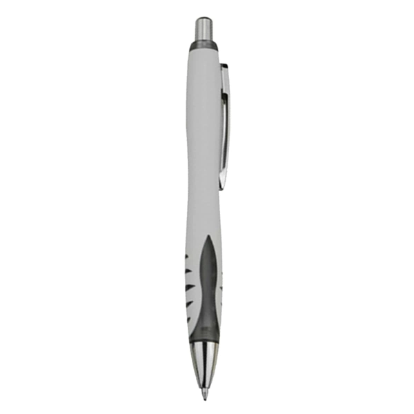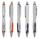 A modern design plastic pen features a solid white barrel and a coloured panel patched soft-touch grip shiny silver push button metal clip and tip high quality Parker-Type German manufactured black ink refill and tungsten carbide ball which brings you the better writing quality 1200 meters writing distance.