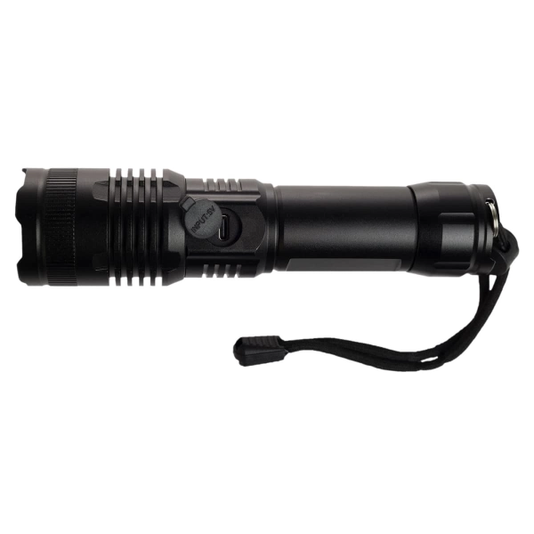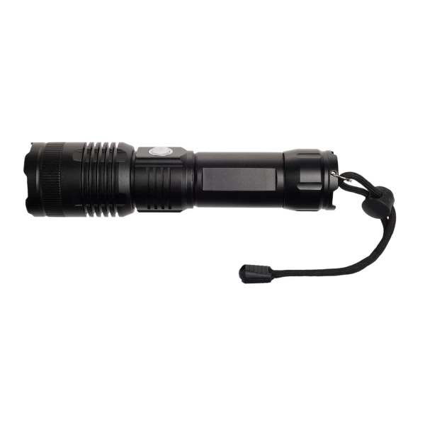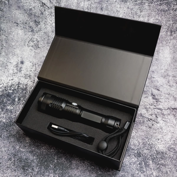 Introducing the Lumi Rechargeable Torch, your eco-friendly and powerful lighting solution. Crafted from recycled aluminium, this torch features a bright SMD LED bulb with a brightness level of 720 lumens, capable of illuminating objects up to 300m away on the narrowest beam setting. Powered by a rechargeable Li-Ion battery (18650, 1200mAh), the torch comes with a black wrist lanyard for easy carrying and a black Type A to Type C cable for convenient charging. Packaged in a sleek black magnetic close gift box with an instruction sheet, the Lumi Torch is ideal for both everyday use and as a thoughtful gift. Please note, the torch is water-resistant but not waterproof and should not be submerged.