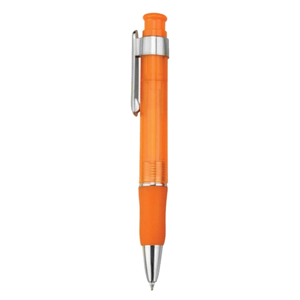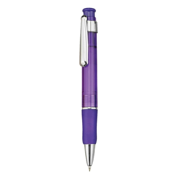 Click action plastic pen transparent coloured barrel with matching coloured rubber grip and shiny silver chrome fittings high quality German manufactured black ink refill 1800 meters writing distance tungsten carbide ball provides you with quality writing.