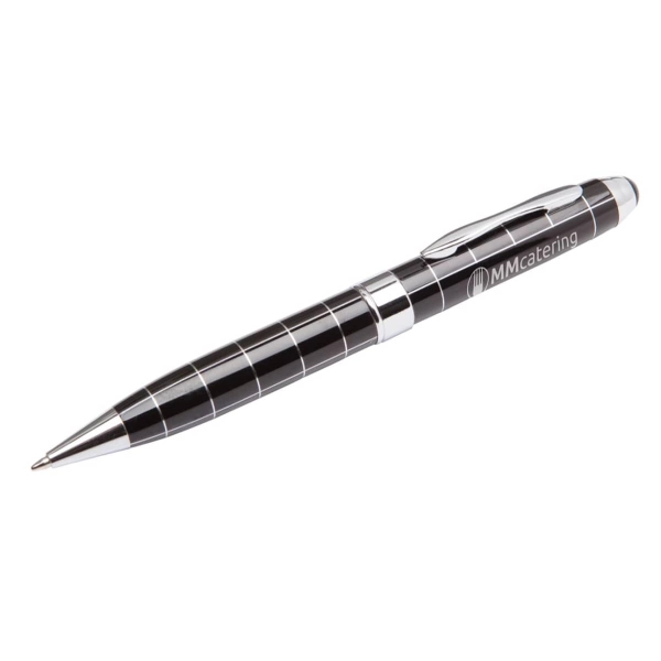A traditional shaped pen with unique silver contrast lines. Available in black with chrome trim.