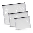 Small cosmetic bag which is manufactured from soft transparent plastic. It has a black zippered closure with black stitching and a polyester lining which can be branded in full colour on both sides at no extra cost. A production lead time of 20 working days applies to this product by air freight and larger orders can be sea freighted on request to reduce the freight cost.