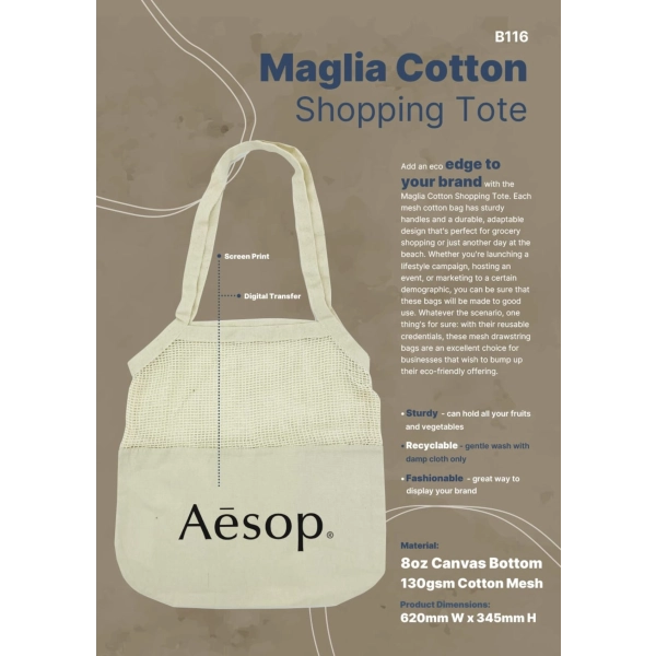 Each mesh cotton bag is designed with sturdy handles and a durable, adaptable style, making it perfect for everything from grocery shopping to a day at the beach. Whether you’re launching a lifestyle campaign, hosting an event, or marketing to a specific audience, these bags are sure to be put to good use. A great alternative to single-use plastic bags, they’re the perfect reusable tote for your clients to take shopping or daily use.