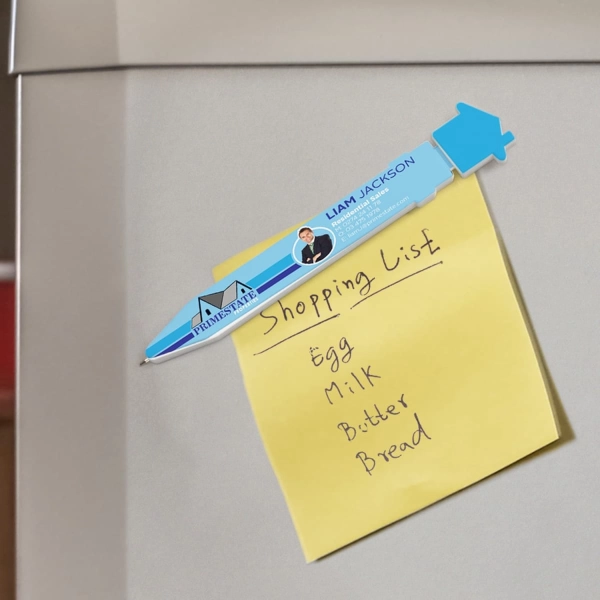 Plastic ballpoint pen with a house-shaped top. The pen doubles as a magnet and can be branded with edge-to-edge full colour artwork. It has a black refill with 800 metres of writing ink.