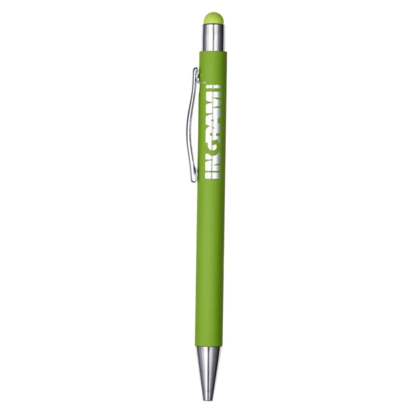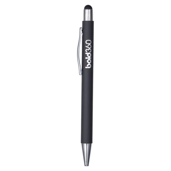 This 140mm click-action metal pen features a distinctive rubberised finish and a matching stylus tip for use on touchscreens. It writes in black ink and engraves to reveal a clean matte finish beneath the surface. With a writing distance of 500 metres, it’s made to last. This 140mm click-action metal pen features a distinctive rubberised finish and a matching stylus tip for use on touchscreens. It writes in black ink and engraves to reveal a clean matte finish beneath the surface. With a writing distance of 500 metres, it’s made to last.