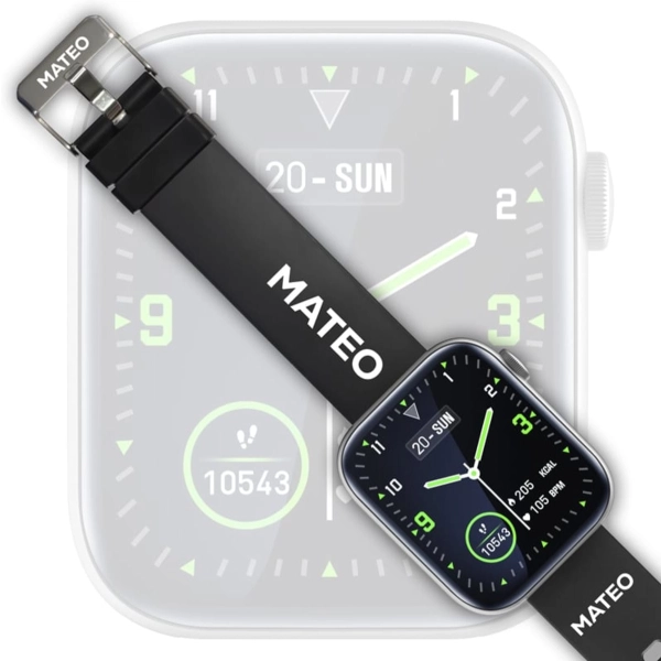 The Mateo smartwatch with a 1.8" curved HD TFT screen features an AI voice assistant and Bluetooth phone calls via your smartphone. In addition, it monitors Heart Rate Monitor, Blood Pressure, and Oxygen levels. While simultaneously providing a variety of watch faces, activity tracking, Bluetooth music control, multi-sport control, stopwatch, camera remote, weather updates, sleep monitoring and social media alerts. Download the user-friendly APP, connect the Bluetooth and synchronise the data to your iPhone or Android smartphones for easy management. Includes a Magnetic USB charge cable and user manual. Material: ABS, Zinc Alloy, Silicone Strap.