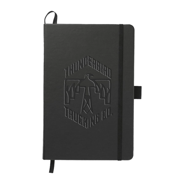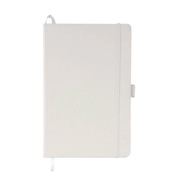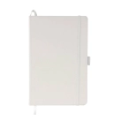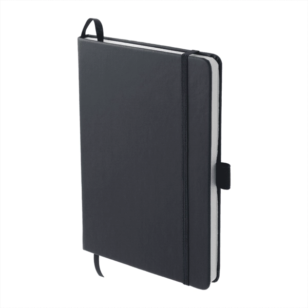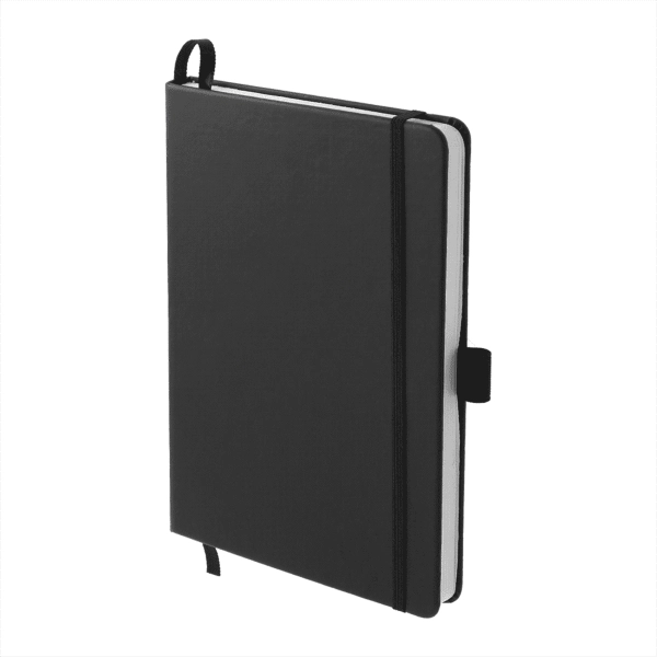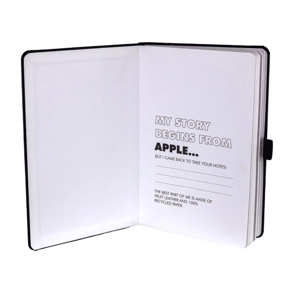 The mela recycled JournalBook ® presents a uniquely crafted hardcover, color-matching elastic closure, pen loop, and ribbon page marker, with 39% of apple components.