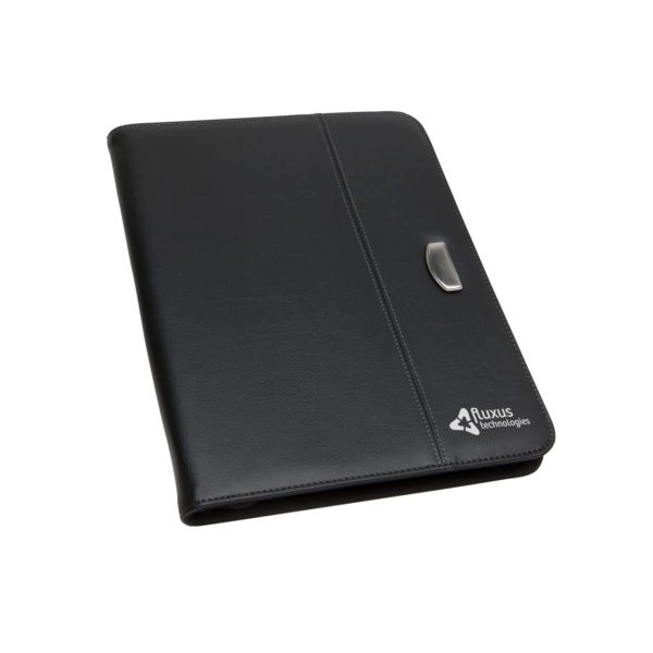 This soft grain finish A4 portfolio with an outer zip closure is designed to keep your contents secure. Your logo can be printed onto the portfolio or engraved on the brushed chrome accent plate (optional). Features include a soft grain finish outer, micro-fibre inner, outer zip closure, brushed silver accent plate, note pad (30 pages), pen loop, internal security zip pocket, multiple card pockets and a gusseted internal brochure pocket.