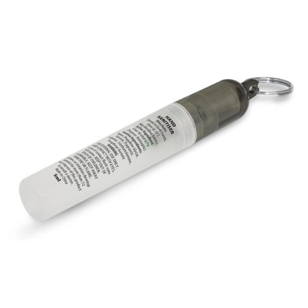 Key ring with a 5ml pump action hand sanitiser. It has full ingredient information printed on one side of the tube with plenty of room for branding on the other.