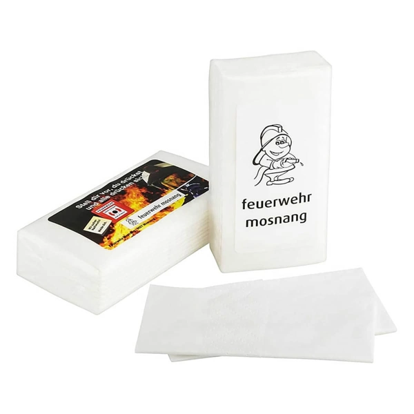 10 sheets soft and hygienic 3-ply dry paper tissues in a plastic pouch with a resealable clear sticker the paper tissue is made of 100% virgin wood pulp and 100% chlorine-free bleached pulp. A handy promotional item for car office and travel industry.