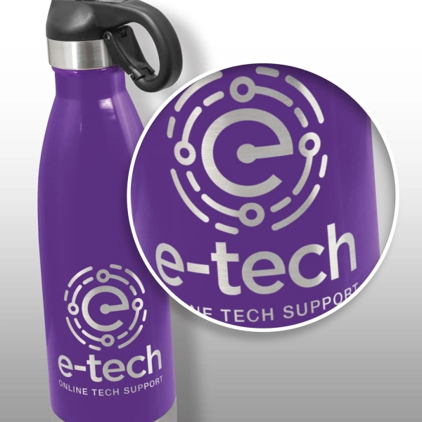 Trendy 700ml stainless steel drink bottle with a timeless design. It has a secure screw on lid which has a flip out drinking valve with a straw and a removable silicone mouth piece. The lid also has a convenient carry handle with a spring loaded carabiner clip. Mirage bottle laser engraves to a shiny steel finish, except for the silver bottle which engraves to a natural etch. Mirage is BPA-free and can be presented in an optional natural gift box. This product is not dishwasher safe and handwashing is recommended.