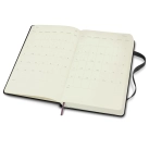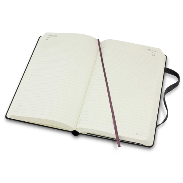 The Moleskine 2026 Weekly Planner is a classic hardcover A5 planner featuring ivory-coloured paper with rounded edges, a bookmark ribbon, and an elastic. Dated from January to December 2026, this elegant planner is formatted to show one day per page. It features an expandable back pocket and has the Moleskine logo subtly debossed on the back cover and printed on the inside front cover. An optional Moleskine Classic Tool Belt is also available. Note this product cannot be supplied without the Moleskine logo. Moleskine reserves the right to decline any custom project or artwork that does not align with its brand on a case-by-case basis. The paper of this Moleskine product is made of material from well-managed, certified forests and other controlled sources.