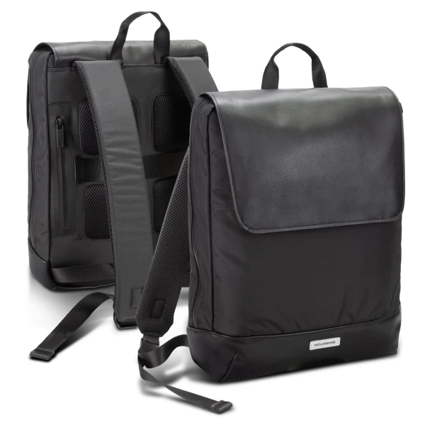 The Moleskine Metro Slim Backpack is an urban lightweight backpack designed to go with you everywhere and carry the day's essentials. This luxury backpack features a flap with magnetic closure and a water-resistant zip to keep all your essentials safe. Inside, the backpack features an organizer, two pen holders, a business card holder, a secure pocket and an inner compartment to protect your laptop. The Metro Slim is fitted with an adjustable padded shoulder strap and breathable air-mesh back for exceptional comfort on the go and a rear luggage sleeve will slide over the handle of a rolling suitcase. A reflective Moleskine logo is sewn onto the leather-look PU base of the backpack. Please note this product cannot be supplied without the Moleskine logo. Moleskine reserves the right to decline any custom project or artwork that does not align with its brand on a case-by-case basis.