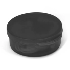 Set of earbuds in a convenient pocket-size plastic carry case. Branding is on the carry case.