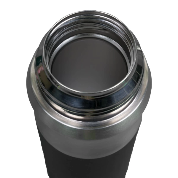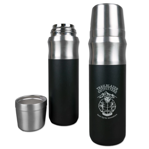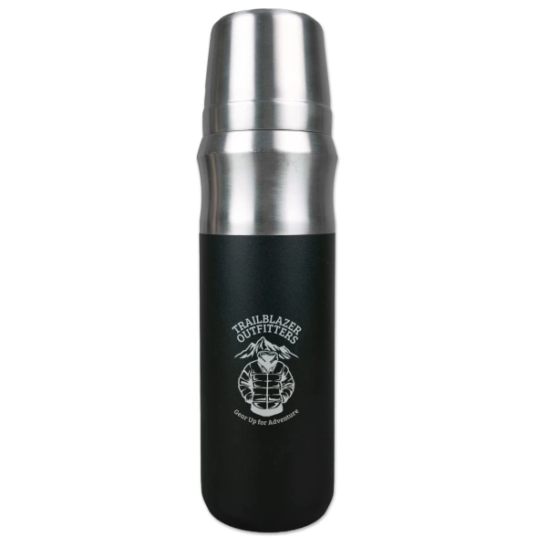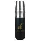 The Monte 600ml Vacuum Flask, designed for superior insulation while on the go. This flask features a double wall construction with 304 grade stainless steel inner and outer layers, ensuring your beverages stay hot or cold for longer. The sleek black powder coating covers approximately 150mm from the base, complemented by a grey lid. The screw-open/push-button lid and stainless steel screw-on cup add convenience to your drinking experience. The cup is perfect for tea, coffee, hot or cold beverages, and more. Standing at approximately 260mm tall (including the cup) with a diameter of 73mm, this flask is perfect for on-the-go hydration.