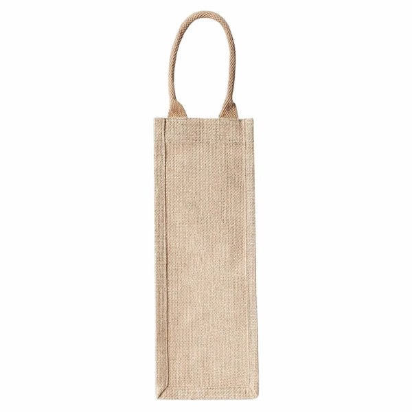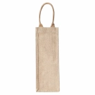 Quality environmentally friendly laminated natural jute single bottle carry bag with padded cotton handles and seamed edges. A great promotional bag for your event or a gift wine bag.