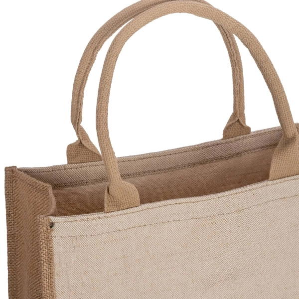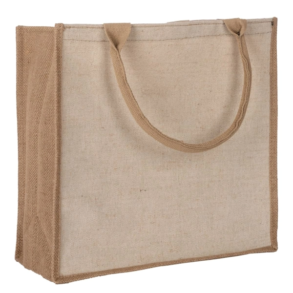 Elegant and smart eco-friendly laminated juco shopping bag has soft padded cotton webbing handles for added comfort. This newest model Mulan compromises of the premium Juco (cotton/jute mix) front and back panels with a standard jute side and base panel. This is the perfect premium reusable bag. With Juco panels this enables an improved print reproduction due to a smoother surface so this bag is ideal for the more complex designs and logos.