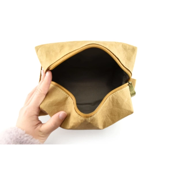 Munro Kraft Paper Cosmetic Bag is manufactured from German 0.55mm kraft paper designed to keep your cosmetics organized and easily accessible. The use of washable kraft paper gives it a unique and natural look while the gray canvas lining adds durability and protection. The brown metal zipper puller enhances the bag's aesthetic appeal and functionality. With its spacious size and reliable zipper closure along with the convenient handle this cosmetic bag is a practical and stylish companion for organizing and carrying your essential cosmetics and toiletries in a neat and organized manner. Whether you're traveling or using it daily this bag is a reliable choice to keep your cosmetics safe and in order.