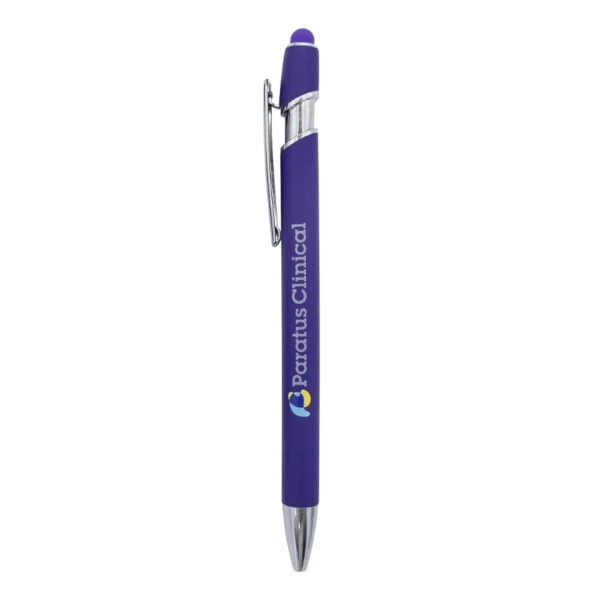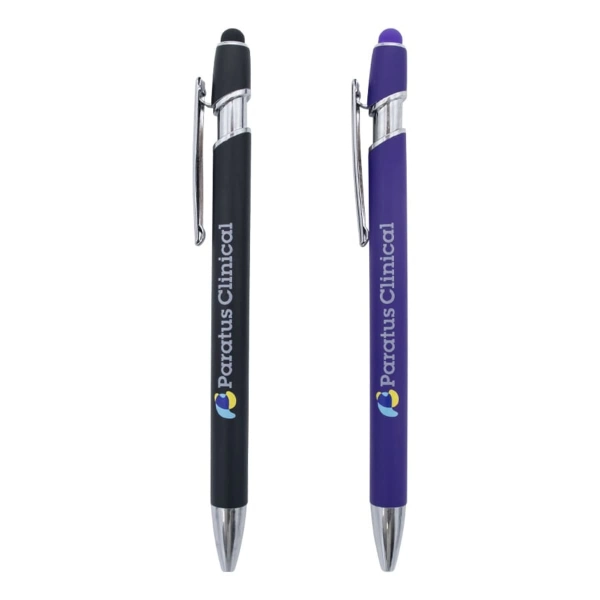 Click action metal pen with unique rubberised finish comes with black ink. Pen features matching stylus tip. Each pen engraves to expose a stunning matte finish.