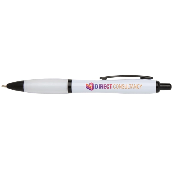 The Nash black edition ballpoint pen has a stylish curvy design with black trims, and is made from RCS certified recycled plastic, reducing the need for virgin materials. Thanks to the fast click action mechanism, the ballpoint pen is quick to use and has a soft grip, which reduces any tension on the writing surface.