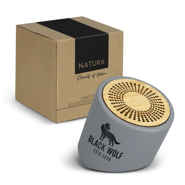 Stylish 3W Bluetooth speaker with limestone cement casing and a natural bamboo grill. The 500mAh battery will play music for up to 3 hours and recharges in 2.5 hours. Pause and play music controls are featured on the speaker base. The speaker is presented in natural kraft gift box with NATURA branding. A Micro-B USB cable and instructions are included.