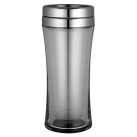400ml double wall plastic travel mug made of food grade transparent plastic and BPA free a stainless steel capped plastic lid with splashproof push-seal closure this product is not dishwasher safe and handwashing is recommended.