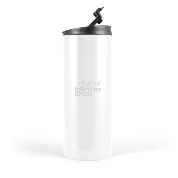 Introducing the Ninja Coffee Cup: a 350ml double-walled stainless steel vacuum cup with a secure screw lid and flip-up tab featuring a silicone seal. Available in five colours, this cup keeps drinks hot or cold for up to 6 hours. Its slim design fits car cup holders. For logo longevity, hand washing is recommended. Not suitable for carbonated liquids or freezing.
