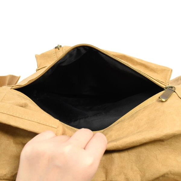 This 0.55mm thick German pre-washed brown washable kraft paper backpack combines a mix of durable and eco-friendly materials with various practical features to make it suitable for everyday use work school or travel. Kraft paper is lightweight with high tear resistance made of natural wooden fiber and synthetic latex. It has a 70D polyester inner liner and top zip closure. The bag features zip closure on the bag top and also buckle closure polyester cotton webbing handle brown canvas adjustable shoulder strap 2 zip pockets inside a laptop compartment and one water bottle pocket on side. The washable kraft paper exterior adds a unique and stylish touch while also ensuring it can withstand regular use and occasional washing.
