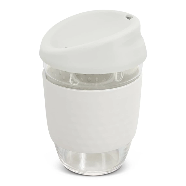 Elegant 350ml reusable borosilicate glass coffee cup with a secure push on silicone lid and a wide heat-resistant silicone band. Borosilicate is lightweight, exceptionally strong and shatter-resistant. It is a BPA-free choice for a clean, pure taste and is a natural alternative to single-use paper cups. The lid and band can be mixed and matched in any colour combination from the standard colours at no extra cost. Up to five different colour combinations are included in the price and more are available for an additional charge. Nova Cup is presented in an unbleached cardboard gift box with a window to show the branding and product care instructions are printed on one side. An optional gift tube is available on request. This product is not dishwasher safe and handwashing is recommended. Nova Cup is protected under New Zealand Design Registration No. 426637 and Australian Design Registration No. 201916426.