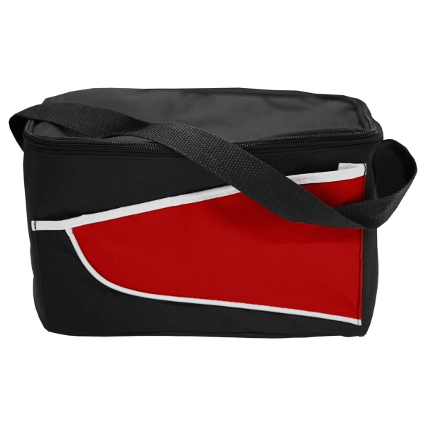 Stylish cooler bag made from 600D polyester with short handles complete PE foam insulation black bag with coloured front pouch handy for your small personal items. A perfect promotional cooler bag for keeping drink and food cool. Capacity 6L.