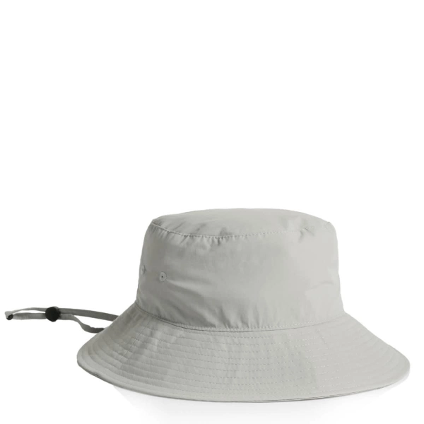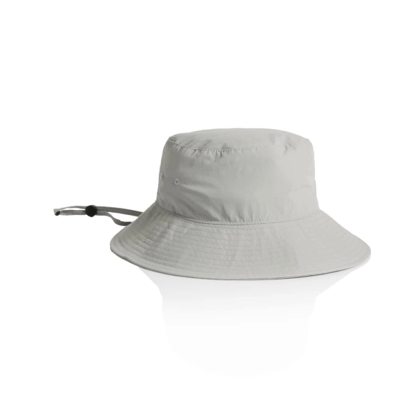 Reinforced large brim with stitching detail, side eyelets, self-fabric chin strap, plastic adjustable toggle