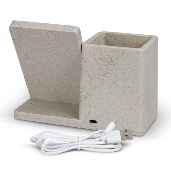 * 10W Fast wireless charger desk caddy manufactured from wheat straw fibre, ABS and cork.