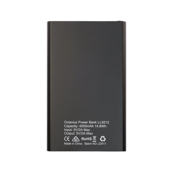 Stay powered up with the sleek Octavius Power Bank. Featuring a durable aluminium shell and 4000mAh Li-Po battery, it’s equipped with a USB-A inlet and Type C outlet, delivering 5V/2A output to keep devices charged on the go. LED indicators display battery capacity, and an on/off button provides control. Includes a 50cm 3-in-1 charging cable (Micro USB, 8-pin, Type C) for ultimate versatility. Available in Black or Silver, presented in a kraft tuck box.