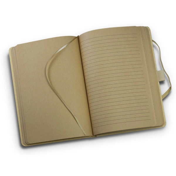 Smart medium-size (approximately A5) notebook with 80 leaves (160 pages) of 70gsm lined and unlined kraft paper and a hard kraft paper cover. It features an elastic closure band, pen loop and a bookmark ribbon. An optional paper belly band is available on request and can be branded in full colour.