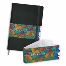 Stylish medium-size (approximately A5) notebook with 80 leaves (160 pages) of 70gsm unlined paper and a hard PU cover. It has an elastic closure band and a bookmark ribbon. An optional paper belly band is available on request and can be branded in full colour.