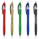One of the most popular slim stylish plastic pen in promotions. Retractable pen with popular contoured design high quality affordable and a great solution for your next tradeshow office re-supply or give away. Metallic coloured barrel with silver push button neck and tip. Cross-type German manufactured black ink and tungsten carbide ball which brings you the better writing quality 1200 meters writing distance.