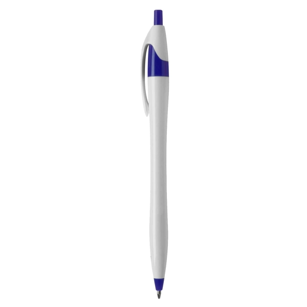 One of the most popular slim stylish plastic pen in promotions. Retractable pen with popular contoured design high quality affordable and a great solution for your next tradeshow office re-supply or give away. White barrel with coloured push button neck and tip. Cross-type German manufactured black ink and tungsten carbide ball which brings you the better writing quality 1200 meters writing distance.