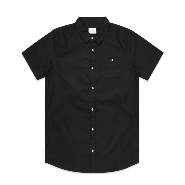 Short sleeve button up shirt, button close chest pocket, clear buttons, side seamed, back yoke, preshrunk to minimise shrinkage
